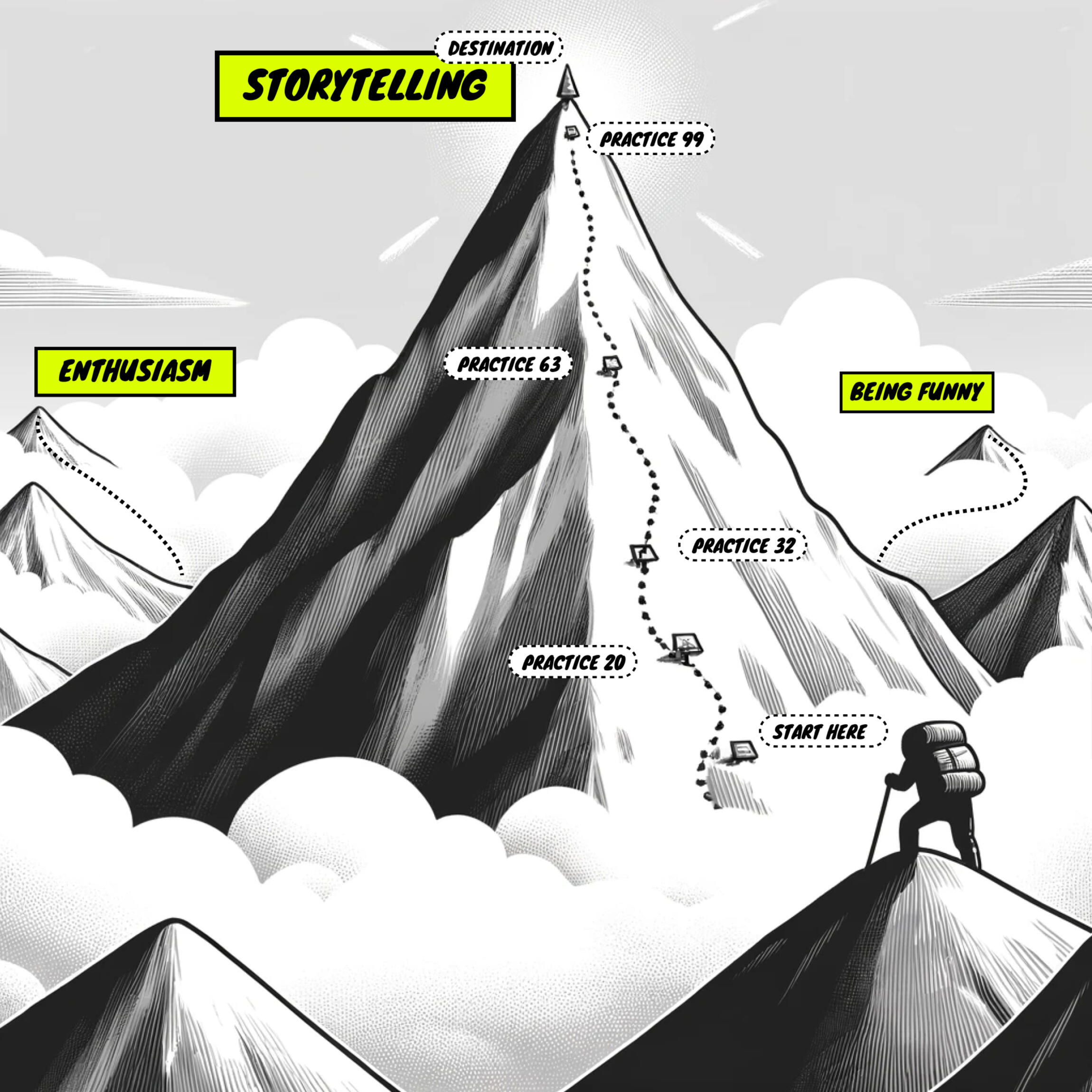 To master anything, commit to 100 intelligent reps—focus on improving one thing each time, and you'll naturally improve.Getting better at storytelling isn’t about a quick fix—it’s about repetition. You need 100 intelligent reps, where each time you focus on improving one small aspect, like refining your hook or shortening a draggy part. This mirrors Mr. Beast’s approach to mastering YouTube: create 100 videos, each better than the last. Most people won’t commit to this grind, but those who do find they don’t need further advice—they’ve mastered the craft through consistent practice.